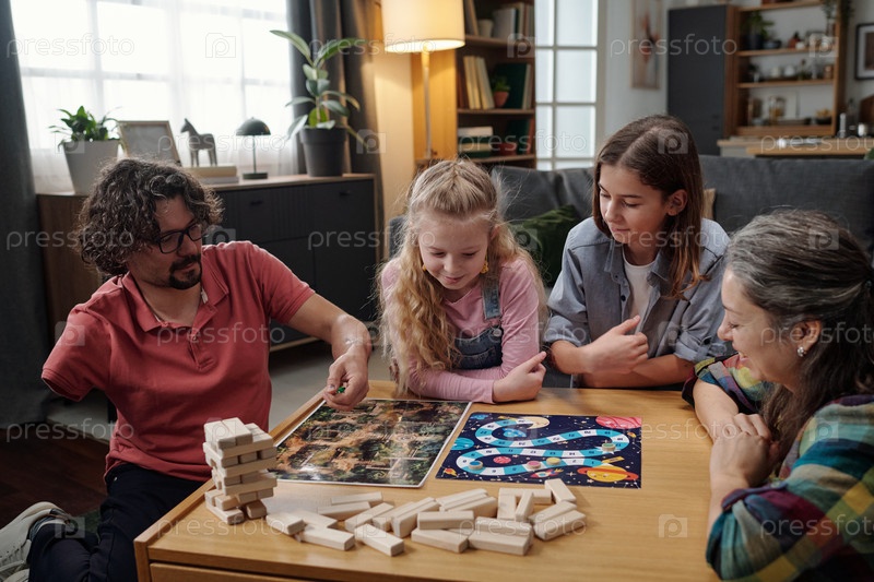 Семейные игровые настольные игры в уютной гостиной