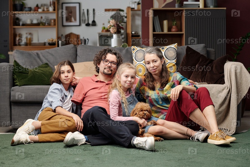 Портрет семьи, отдыхающей на ковре в гостиной с собакой