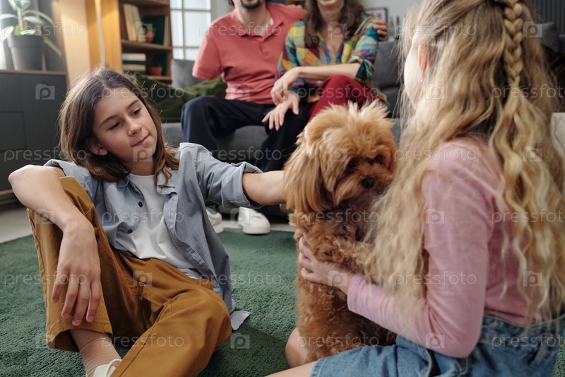 Семья проводит качественное время с собакой в гостиной