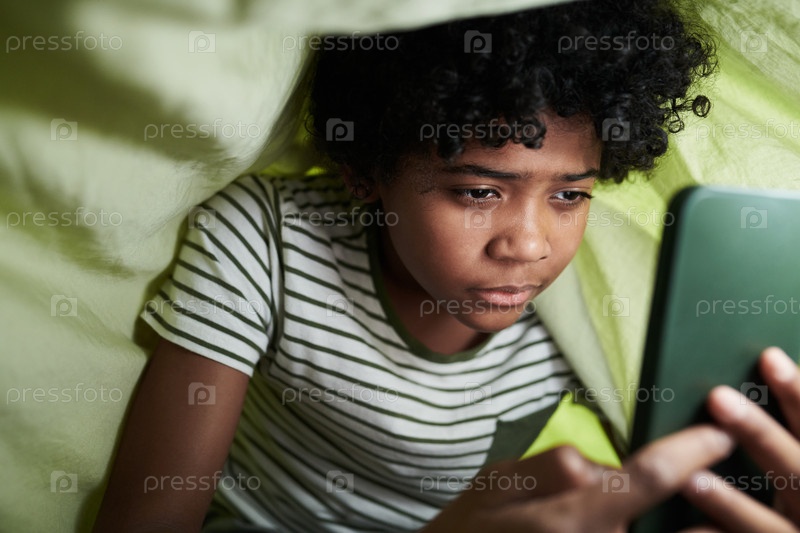 Молодой мальчик занимается со смартфоном под одеялом
