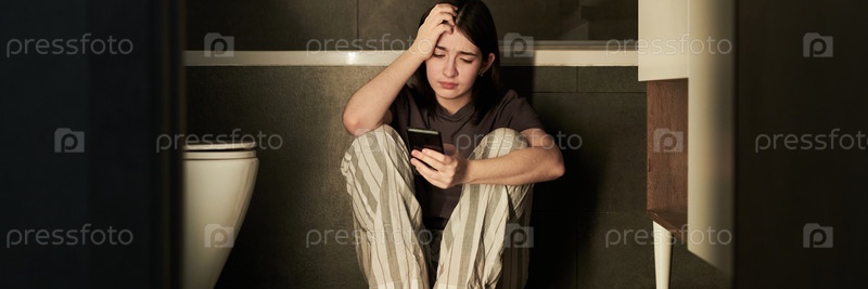 Созерцание в ванной, глядя на телефон