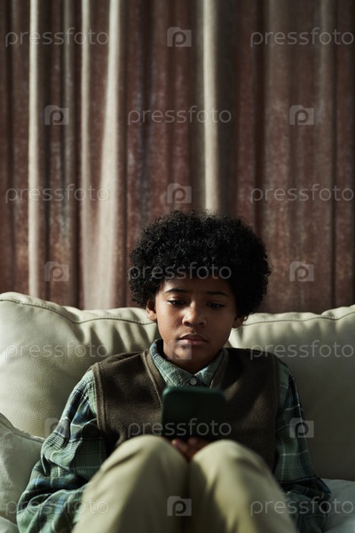 Молодой мальчик сидит на диване и смотрит на мобильный телефон