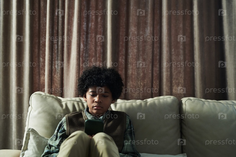 Молодой мальчик сидит на диване и играет со смартфоном