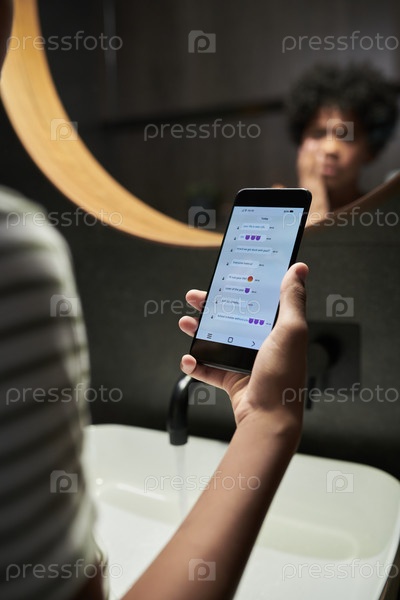 Поддержание смартфона с отраженным лицом на заднем плане