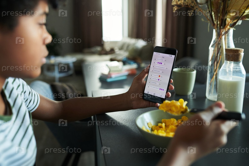 Наблюдение за телефоном во время еды утренних хлопьев