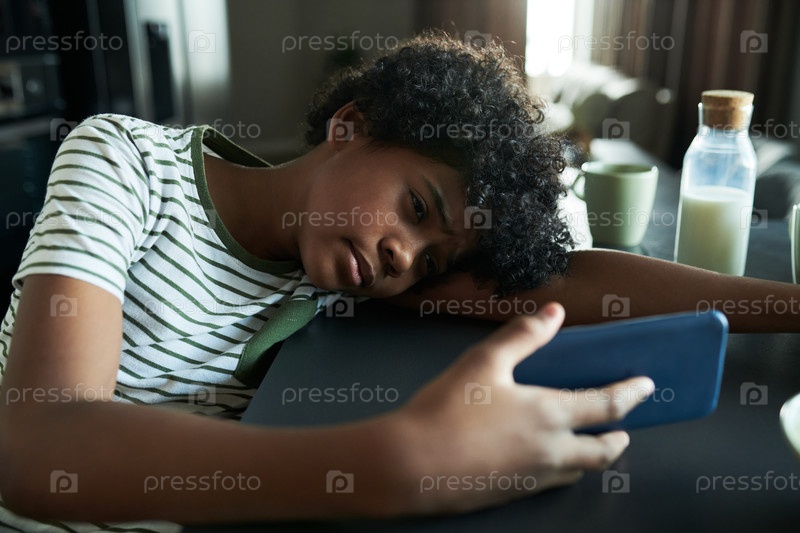 Афроамериканский ребенок держит смартфон в гостиной