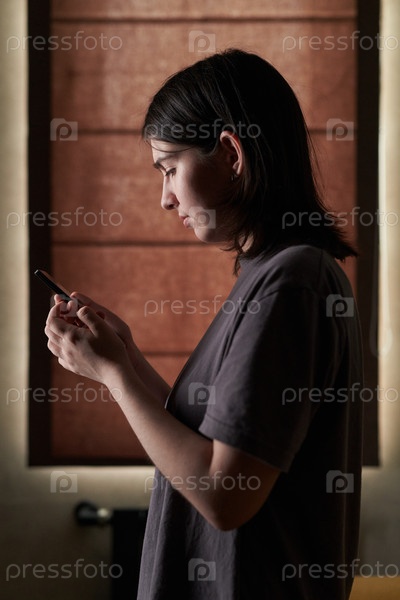 Молодая девушка поглощена смартфоном в темно освещенной комнате