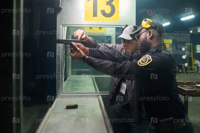 Инструктор помогает студенту с огнестрельным оружием на стрелковом полигоне