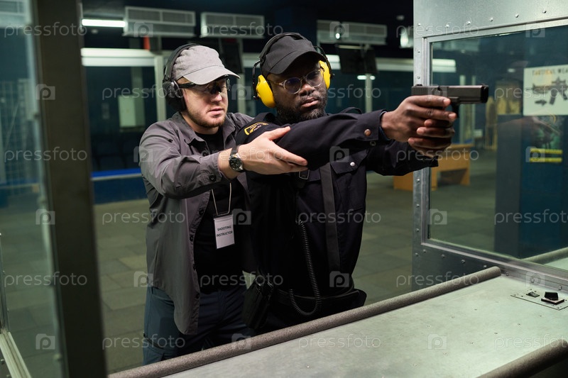 Обучение инструктора, помогающего афроамериканскому мужчине стрелять из ружья