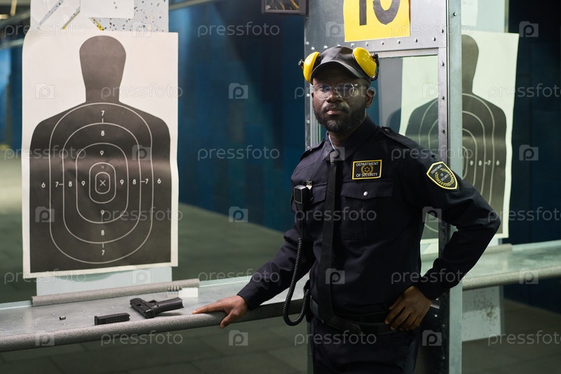 Портрет охранника на стрельбе, держащего огнестрельное оружие