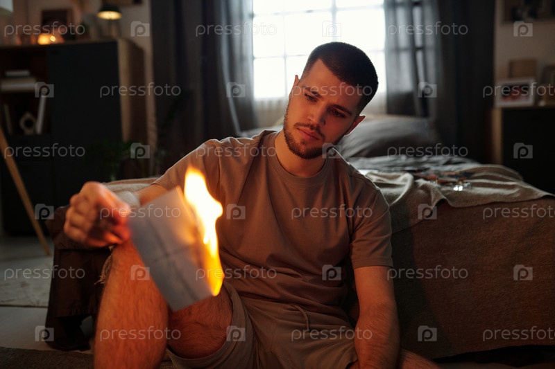 Молодой человек смотрит на горящий конверт, сидя в спальне