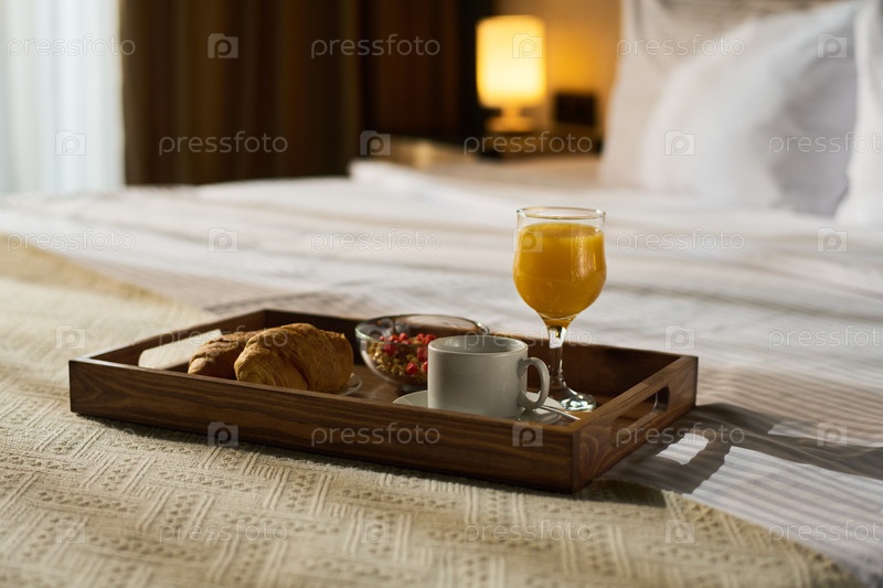 Наслаждаться завтраком в постели с свежим апельсиновым соком