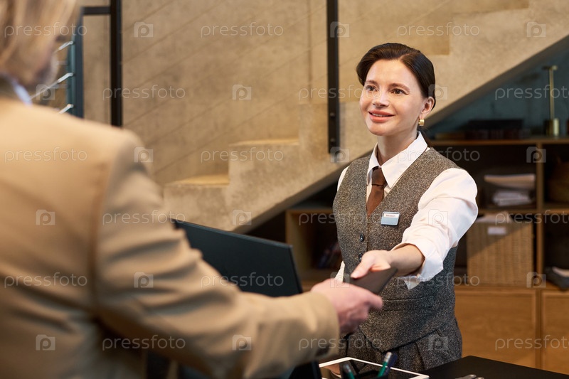 Улыбающаяся рецепционистка приветствует клиента в офисной вестибюле