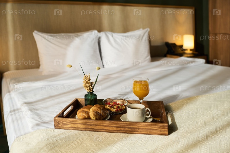 Поднос для завтрака в постели с свежим апельсиновым соком и круасантами