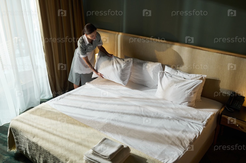 Уборщица делает кровать в гостиничном номере