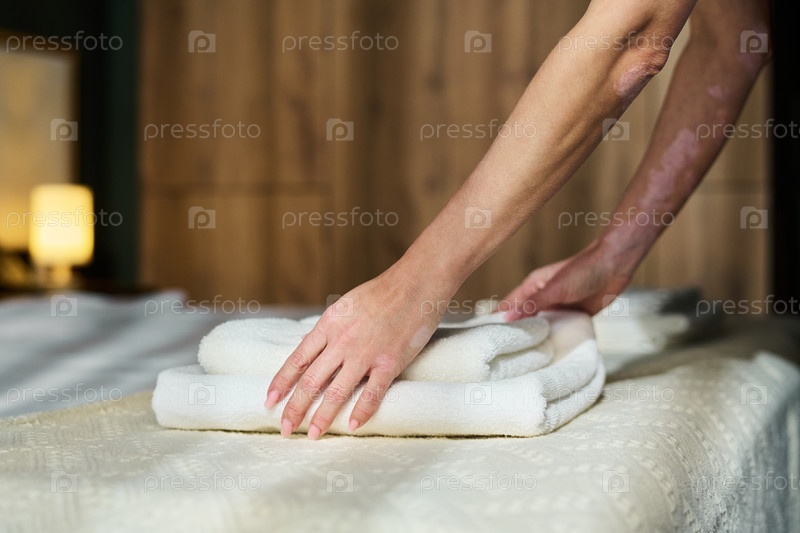 Человек, устраивающий свежие полотенца в гостиничном номере