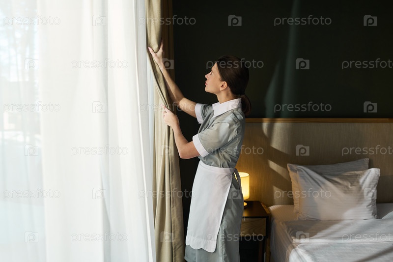 Хозяйка открывает шторы в солнечном номере отеля
