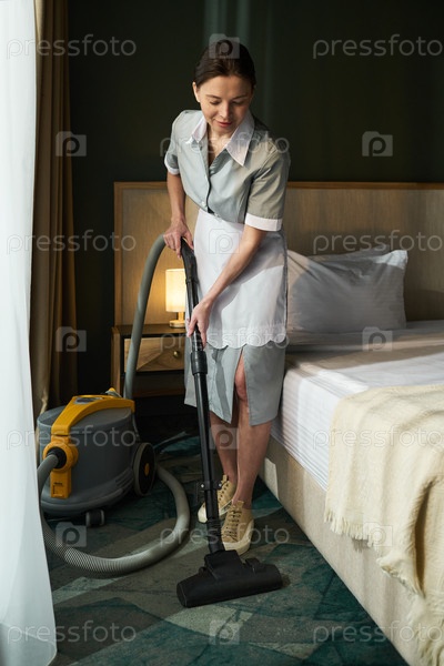 Профессиональная уборка с использованием вакуума в гостиничном номере
