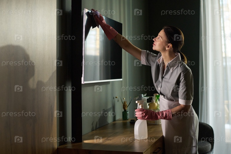 Профессионал по уборке, работающий в слабо освещенной комнате