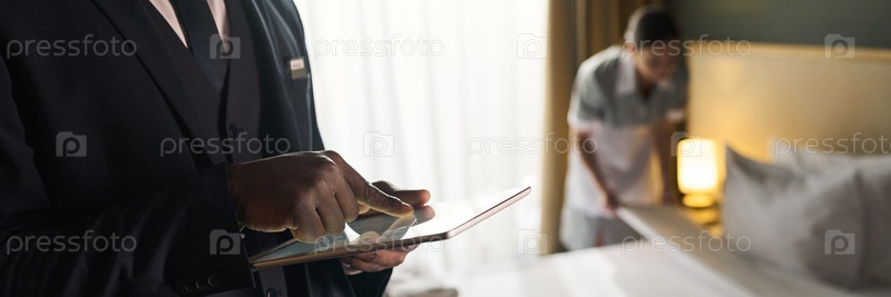 Бизнесмен использует планшет в современной обстановке гостиничного номера