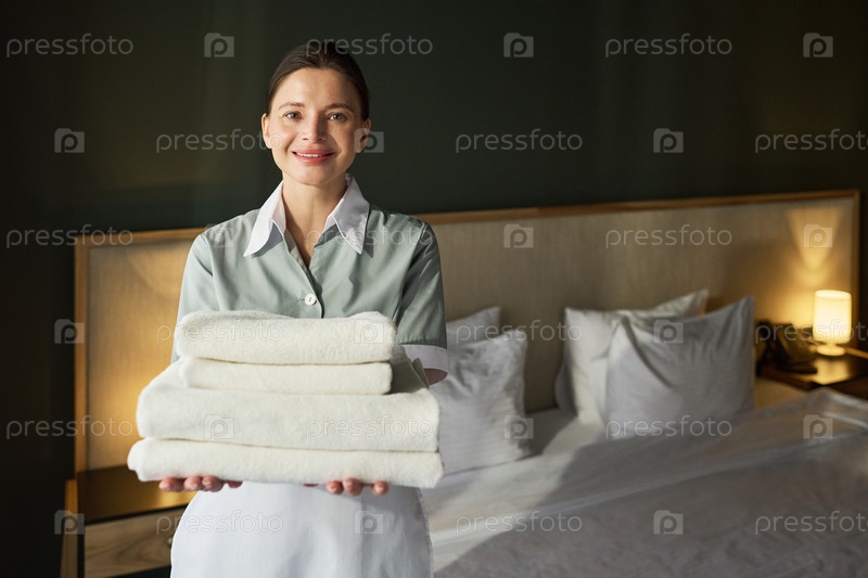 Портрет улыбающейся гостиничной горничной, держащей свежие полотенца