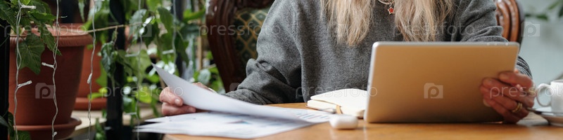 Женщина, просматривающая документы при использовании планшета
