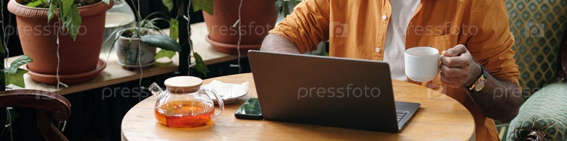 Человек, держащий кофейную кружку сидя за столом с ноутбуком