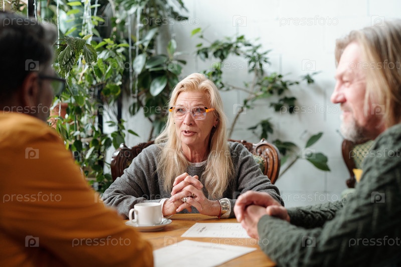 Старшая женщина обсуждает с коллегами в офисной обстановке