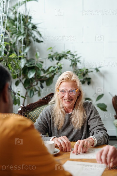 Улыбающаяся старшая женщина участвует в разговоре за столом