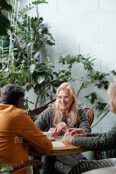 Пожилая женщина ведет разговор в уютном кафе для пожилых людей