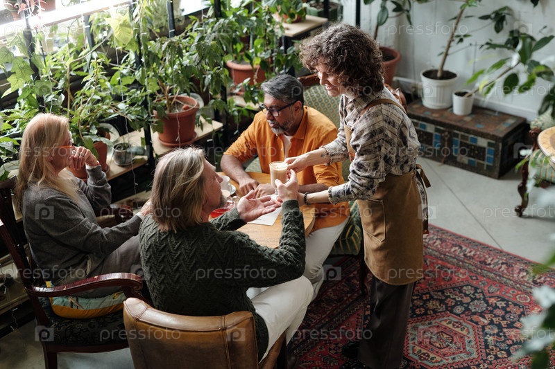 Группа обсуждает и делится чаем в уютном кафе, наполненном растениями