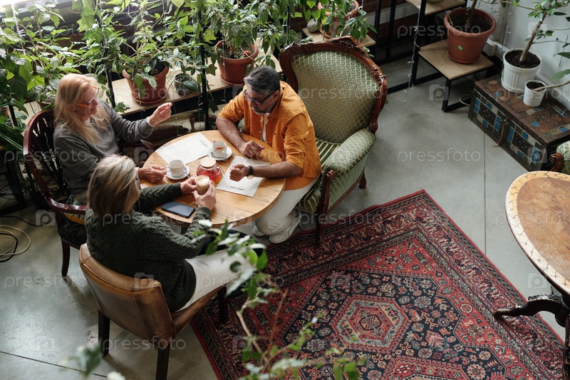 Обсуждение за кофе в уютном кафе, окруженном зеленью