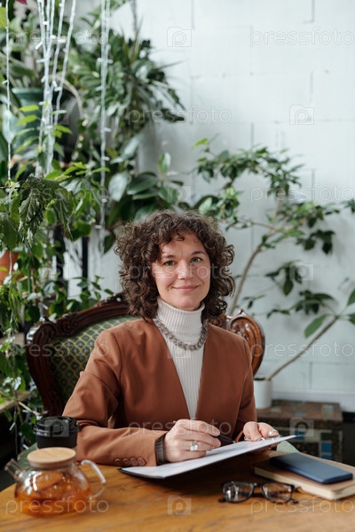 Улыбающаяся деловая женщина работает в офисе, украшенном растениями