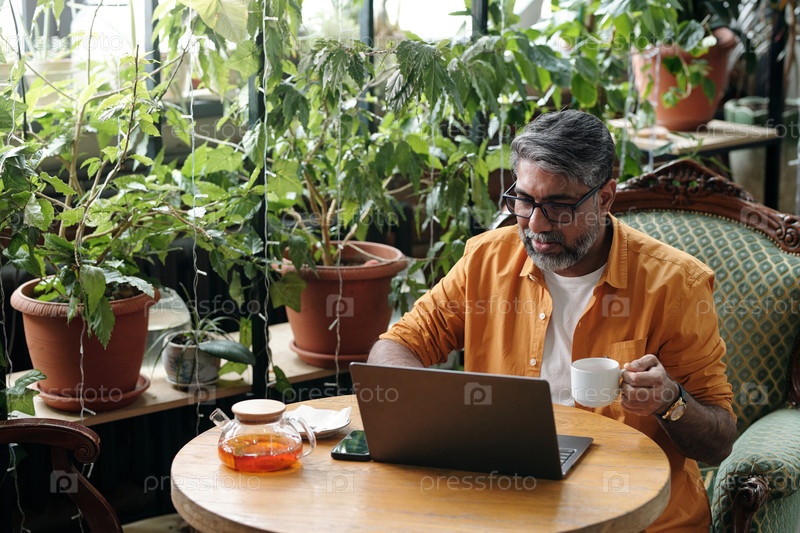 Старший мужчина пьет кофе, используя ноутбук в уютном кафе