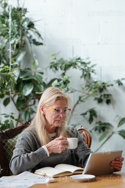 Пожилая женщина использует планшет, выпивая кофе
