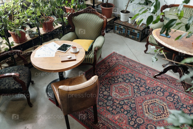 Уютный уголок кафе с растениями и деревенской мебелью