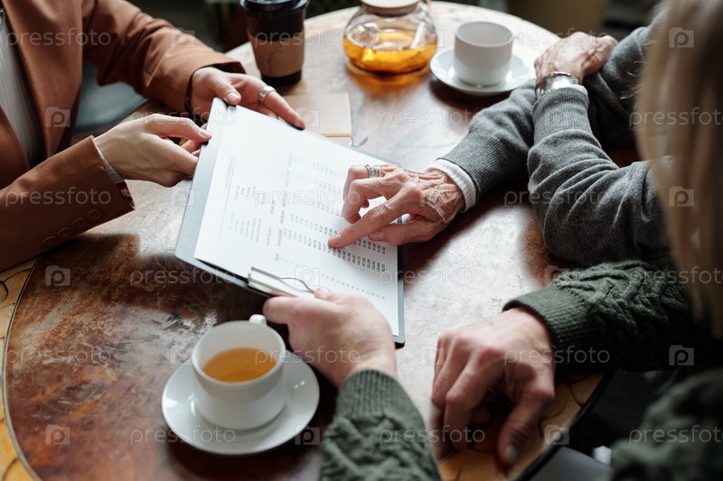 Пожилые люди обсуждают документ за кофе в кафе