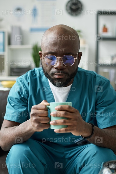 Американская медсестра пьет горячий напиток в офисной обстановке афроамериканцев