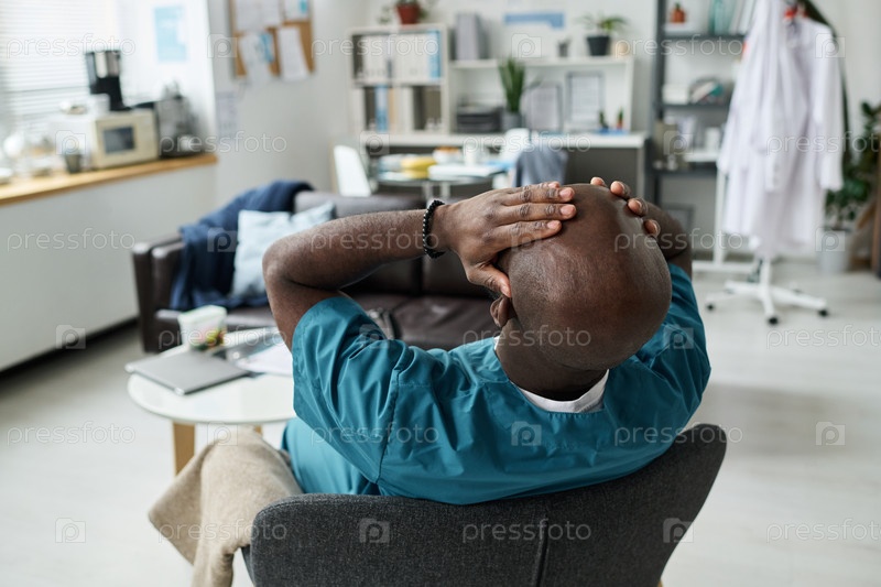 Исчерпанный медицинский работник отдыхает в врачебном кабинете