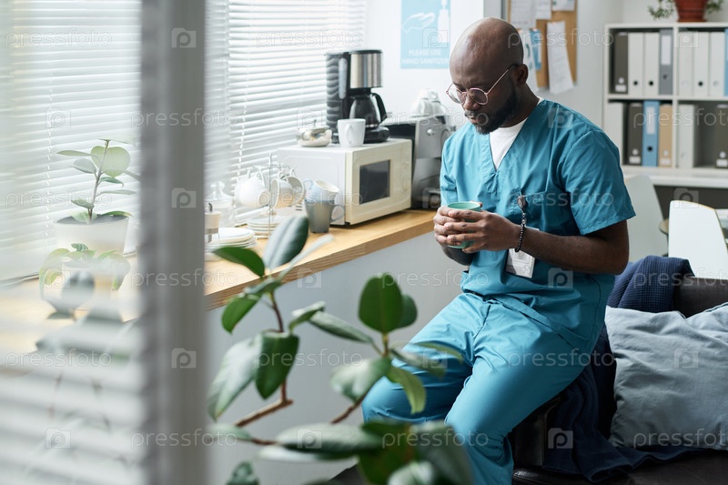 Медицинский работник отдыхает с кофе-брейком в офисе