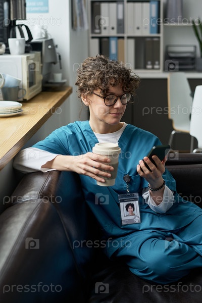 Медицинский профессионал проверяет смартфон, держа кофе