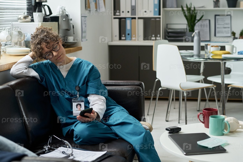 Расслабляющая медсестра на диване в комнате отдыха