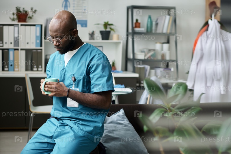 Афроамериканский врач пьет кофе в офисе
