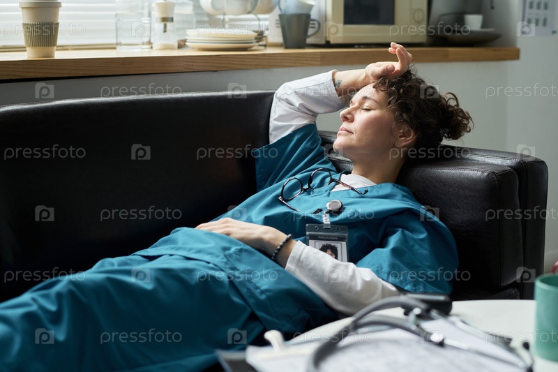Медицинский профессионал отдыхает на диване в комнате для перерывов