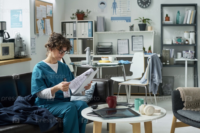 Медицинский профессионал, рассматривающий документы пациентов в офисе