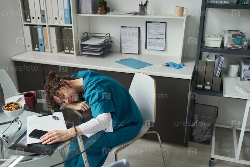 Медсестра отдыхает за столом в больничном кабинете