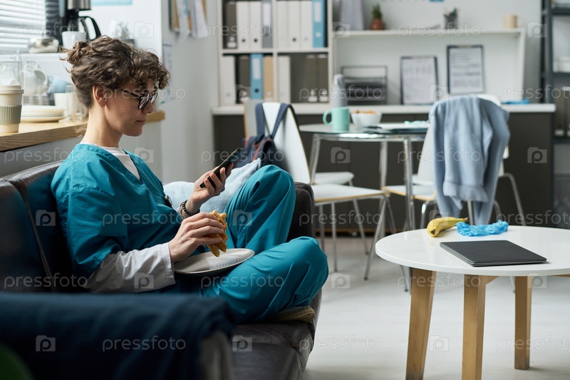 Медсестра делает перерыв и ест фрукты в больничной комнате