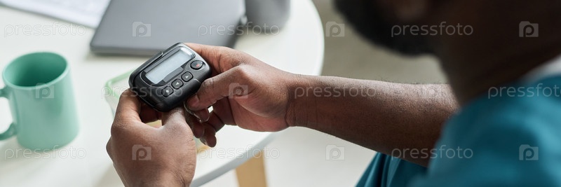 Человек держит пейджер, сидя за столом
