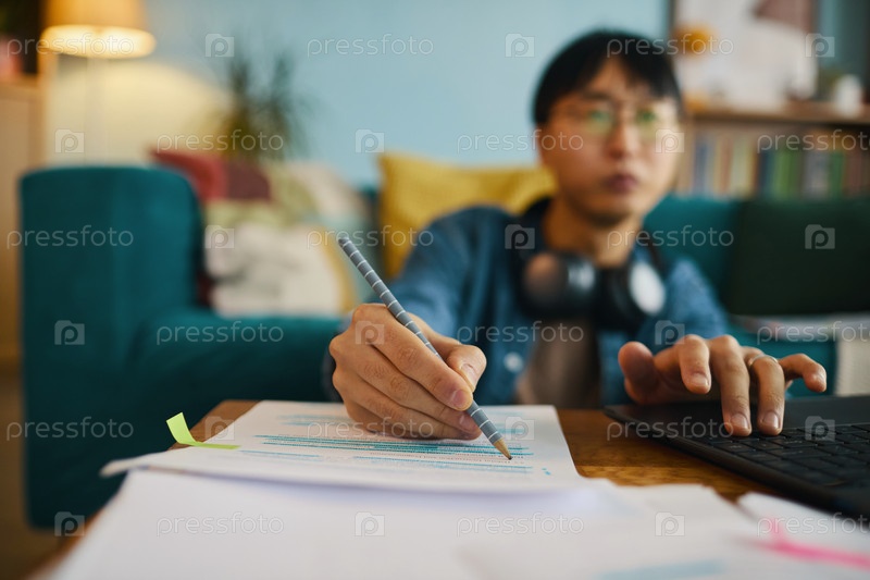 Работая, анализируя бумаги с помощью ноутбука в домашнем офисе