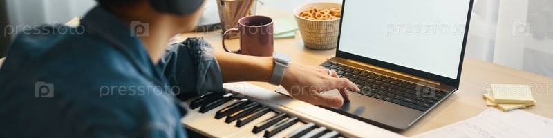 Работа над музыкальным производством с помощью ноутбука и клавиатуры MIDI